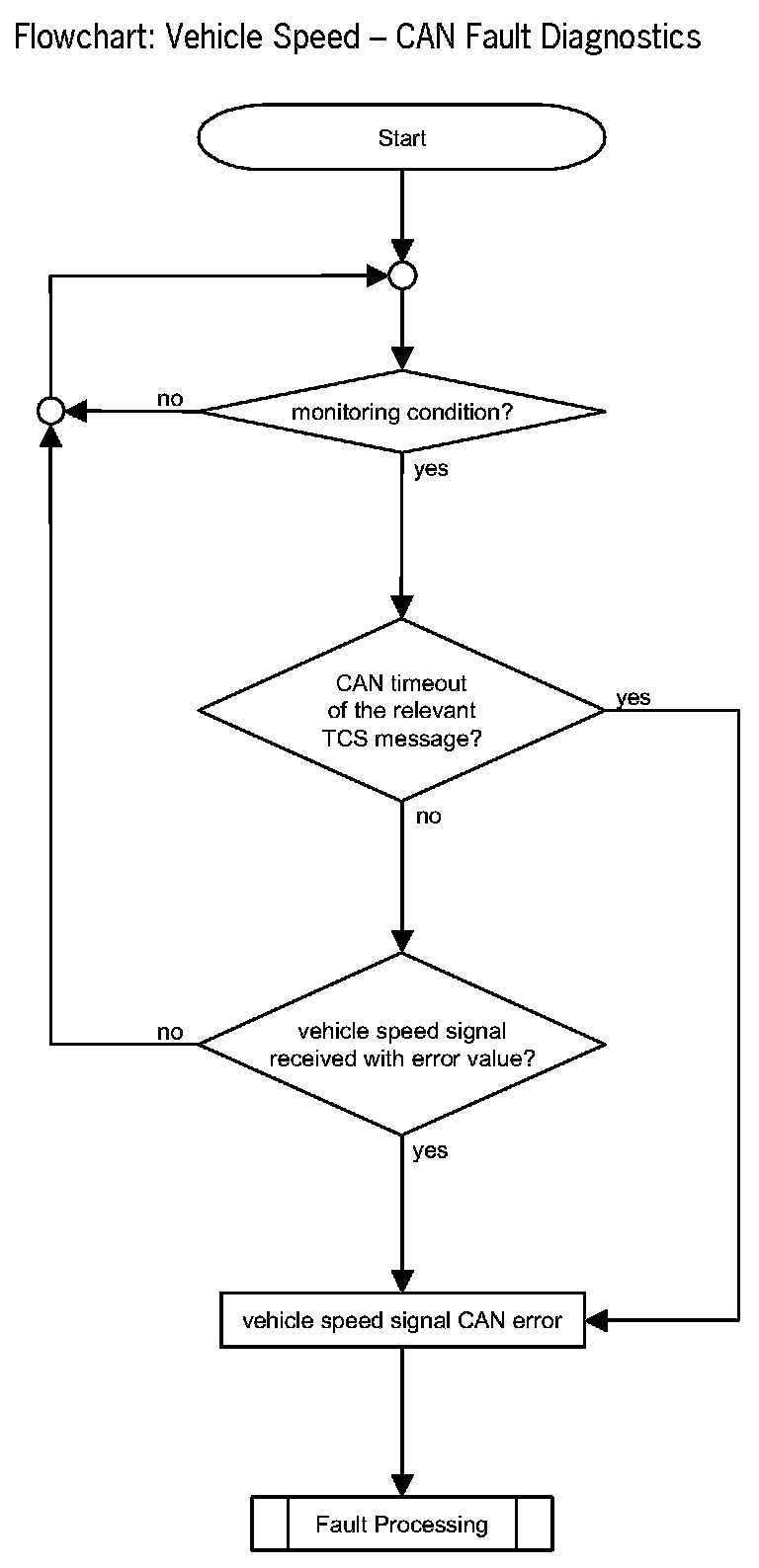 The purpose of this diagnostics is to detect vehicle speed CAN errors. This can be a timeout of the messages which contain the vehicle speed signals or a signal received with error value.
