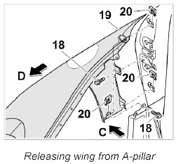 1. Unscrew fastening screws -18- at A-pillar and pull wing out -19- downwards -C- and forwards -D-.