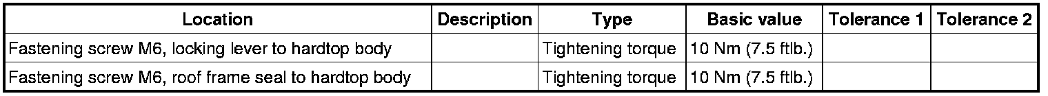 11.1. Engage roof frame seal in the hardtop body at the corners and fasten with the fastening screw -1-. Tightening torque => Tightening torque : 10 Nm (7.5 ftlb.)