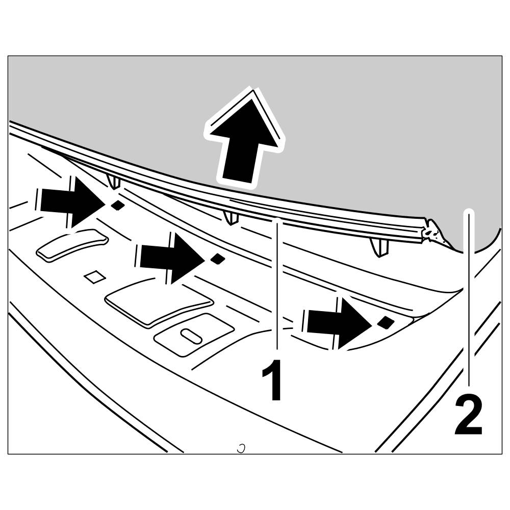 8.1. Lift front retaining strip -1- of roof liner -2- with a plastic spatula and pull it off.