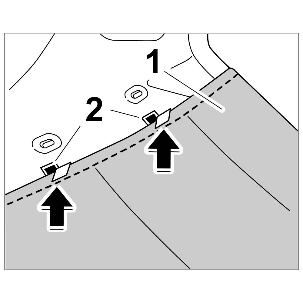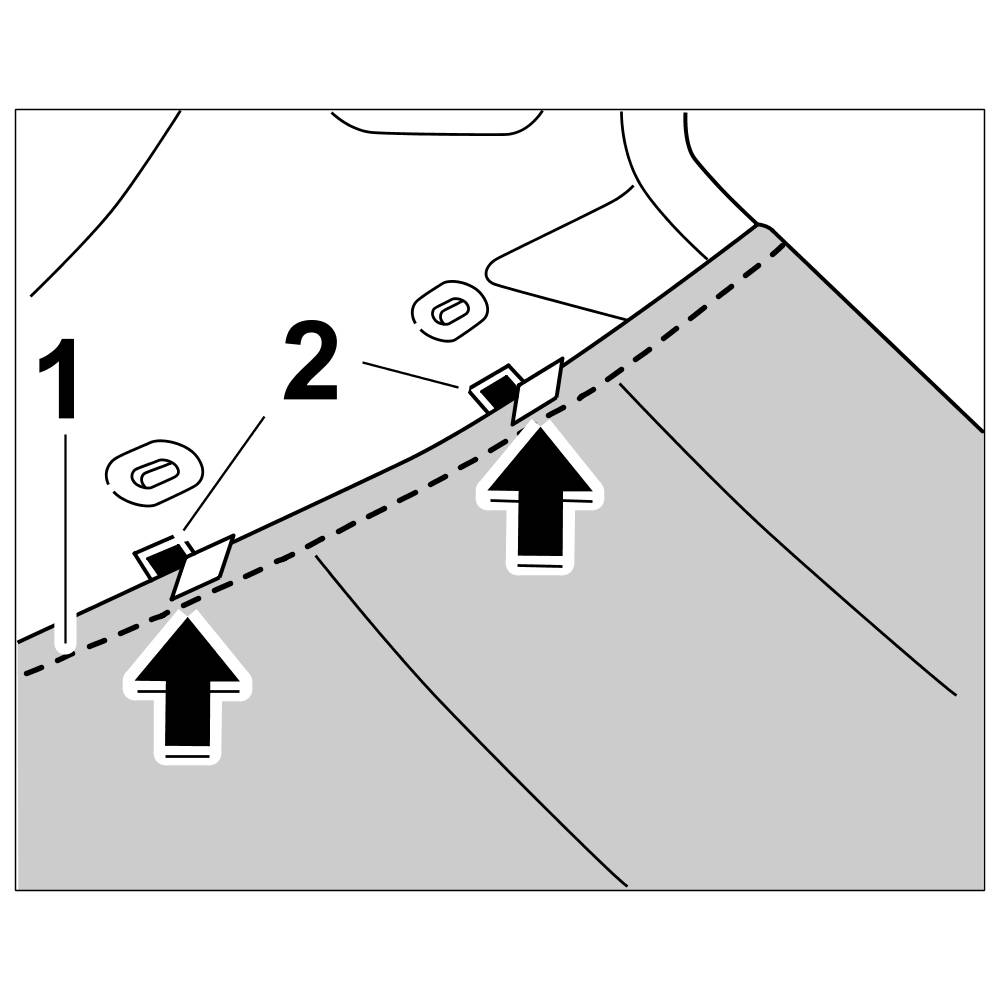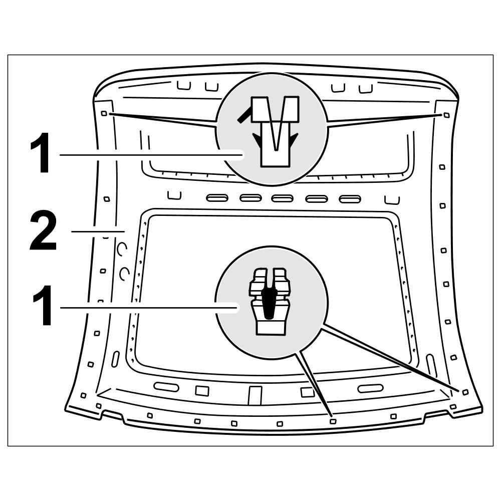 7.1. Engage roof liner -1- at the left and right sides in the sheetmetal clips -2-.