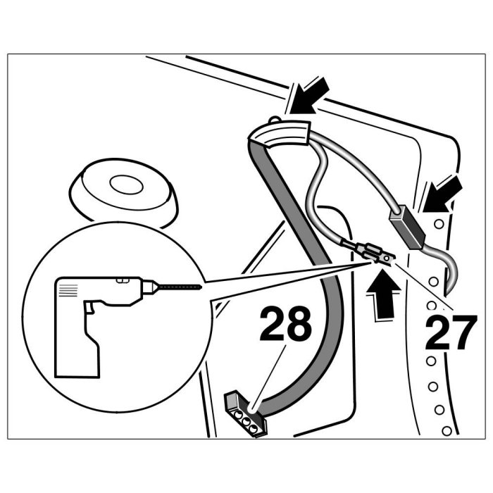 12.1. Drill out the 3.2 mm -27- tubular rivet. Disconnect electric plug connection -28- , remove wiring harness with hardtop locking mechanism from hardtop body.