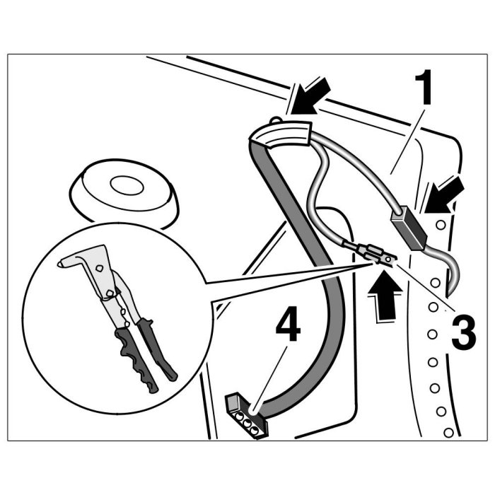3.1. Position wiring harness with the hardtop locking mechanism, rivet the flat connector -3- onto the hardtop body -1- with a 3.2 mm tubular rivet and connect the plug connection -4-.