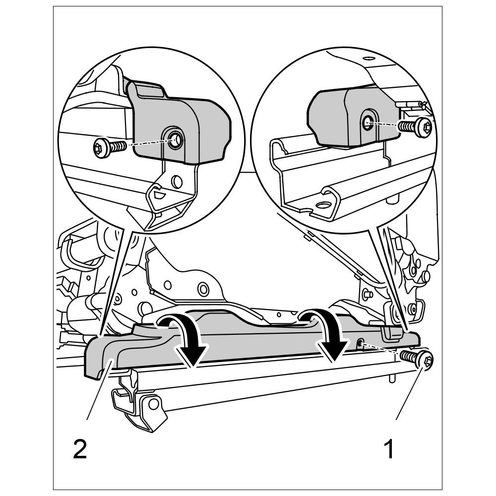 1. Fit backrest frame -2- into the seat frame, position it correctly and secure with the fastening screws -1-. Tightening torque=> Tightening torque: 34 Nm (25 ftlb.)+/-4 Nm (+/-3 ftlb.)