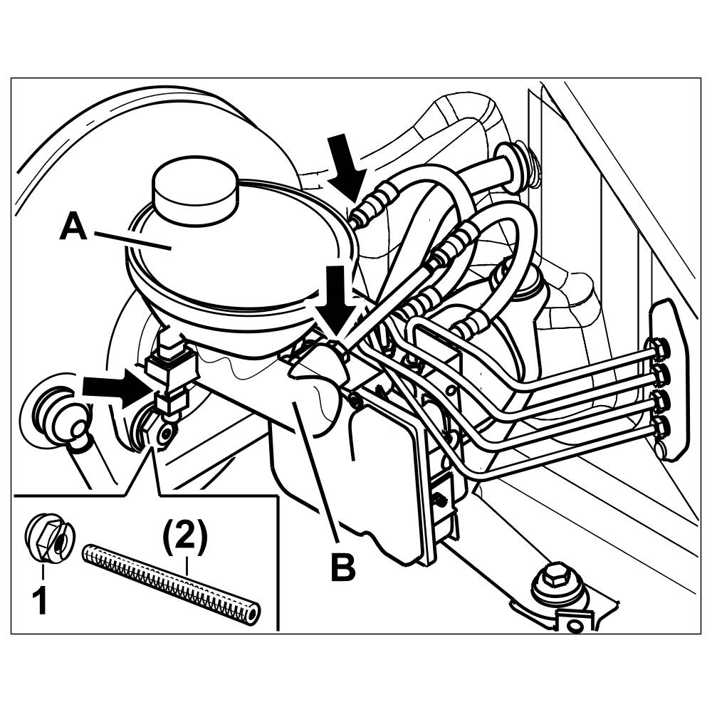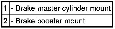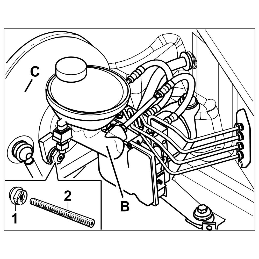The brake master cylinder -B- is secured to the brake booster -C- with two hexagon nuts -1-.