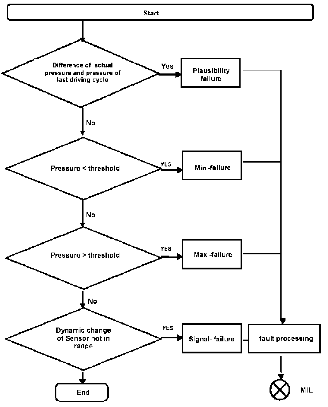 If the difference of the pressure of the last driving cycle and the pressure at the begin of the actual driving cycle exceeds a threshold, a plausibility fault is assumed.