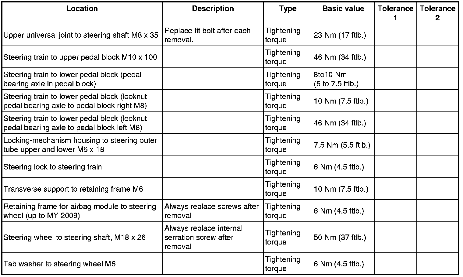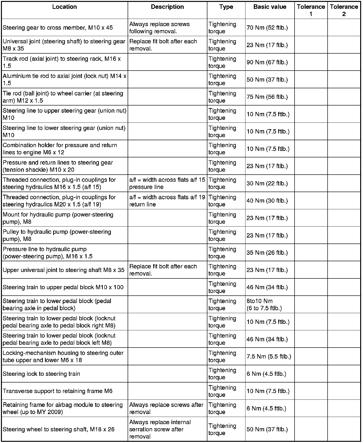 Tightening torques for