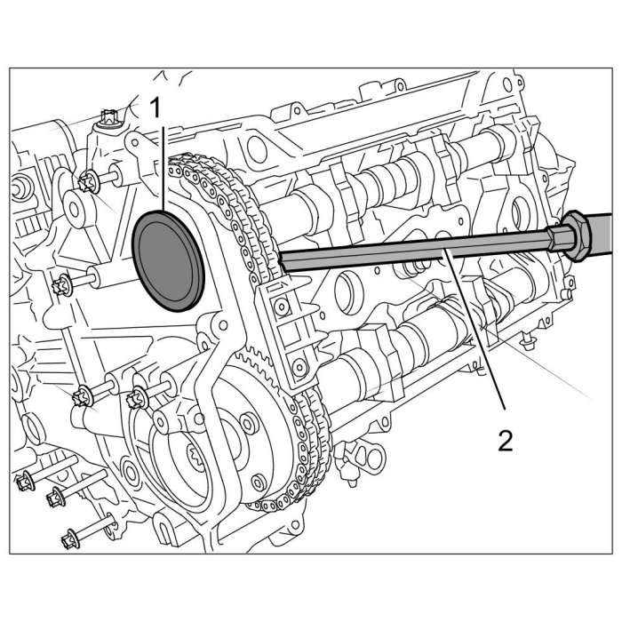 2. Remove two bearing pins on the cylinder head - one at the top for the guide rail -1- and one at the bottom for the tensioning rail -2-.
