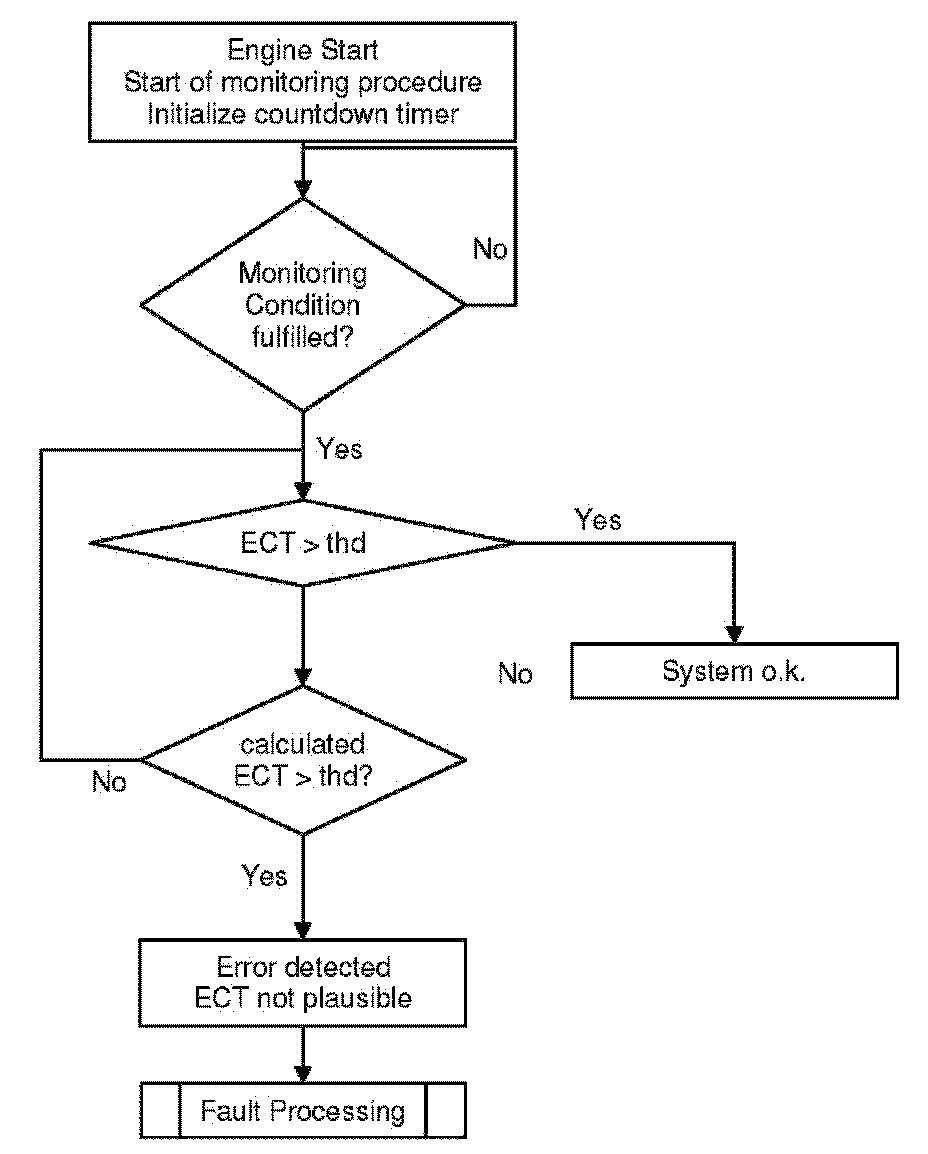 This coolant temperature plausibility diagnosis is performed once per engine run. At low ambient temperature a stuck open thermostat can cause an insufficient engine warm up. In the case that the coolant temperature is lower than the start temperature for coolant thermostat diagnosis a coolant temperature plausibility error will be detected.