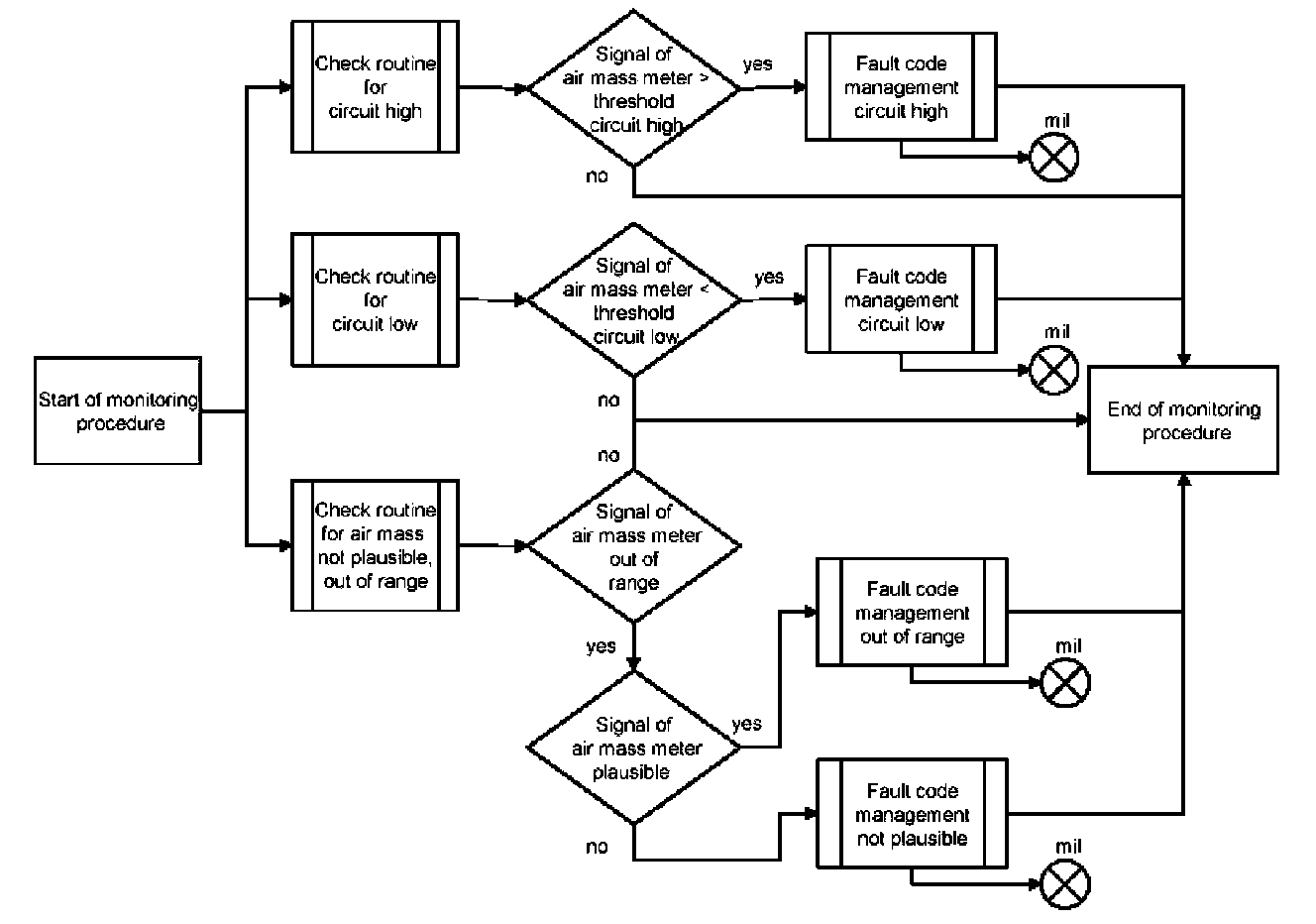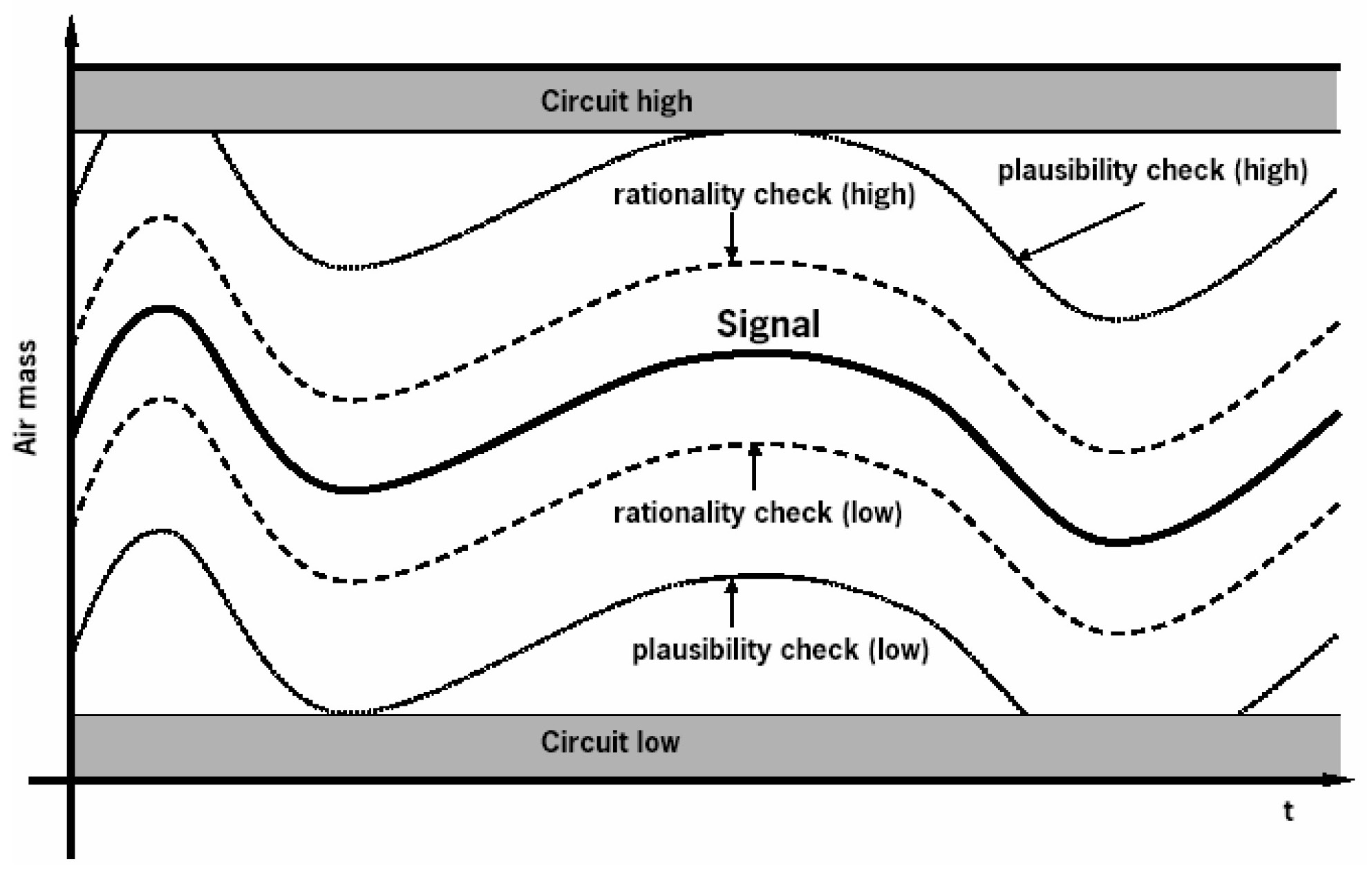 The output voltage of the air mass meter is a measure of air mass. The diagnostic routine compares the mass flow measured by the air mass meter with a calculated mass flow, derived from engine speed an throttle position.