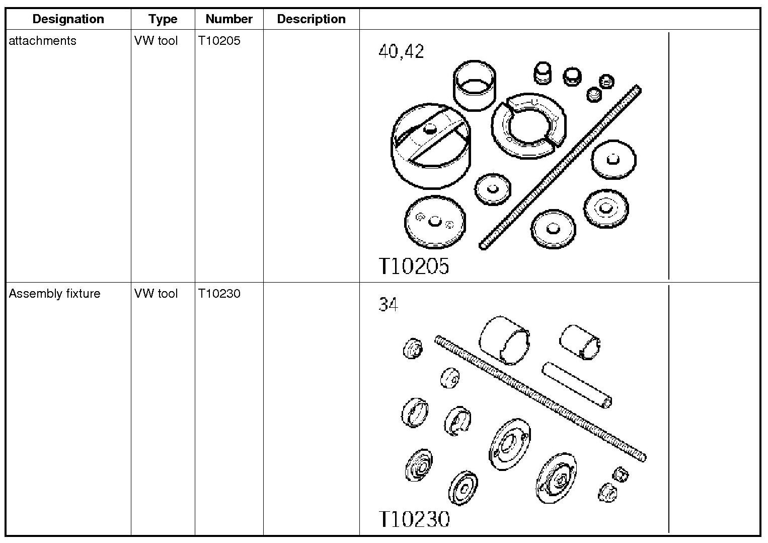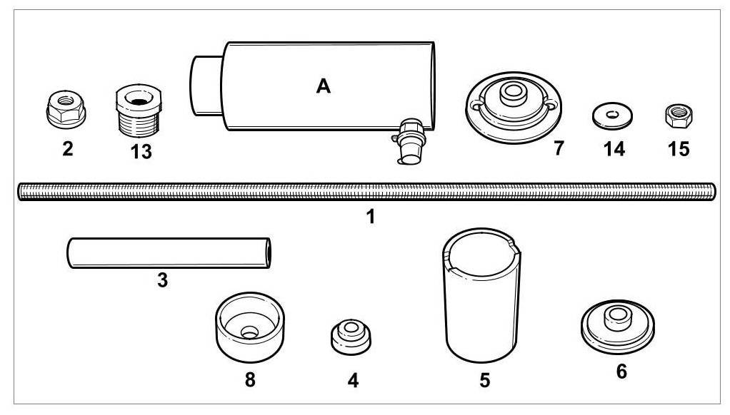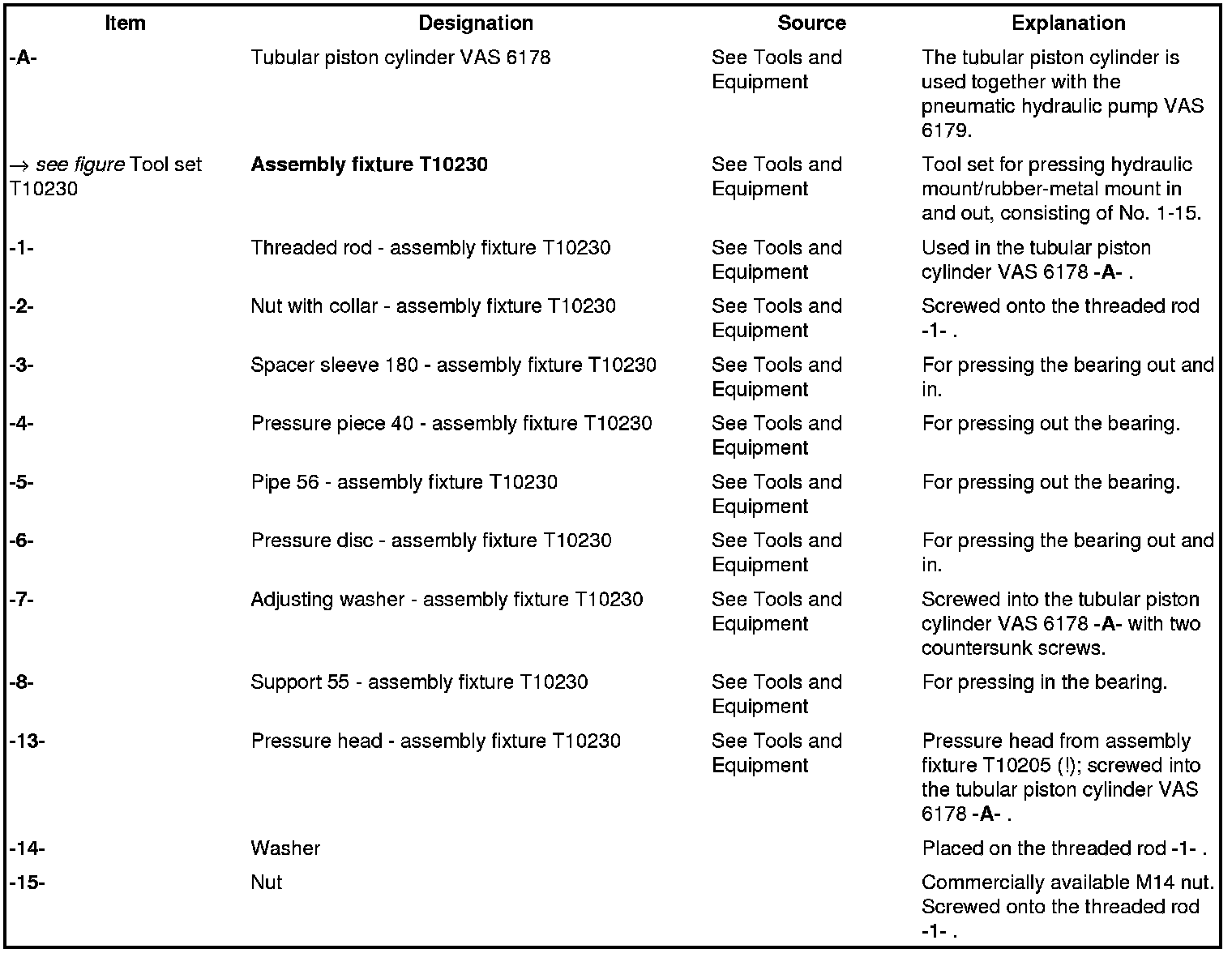 1. To fit the new bearing use the -pressure pieces- and tubular cylinder VAS 6178. No. 13 is screwed into the tubular piston cylinder. No. 2 is screwed onto the threaded rod and positioned in No. 13 for pressing in the bearing.