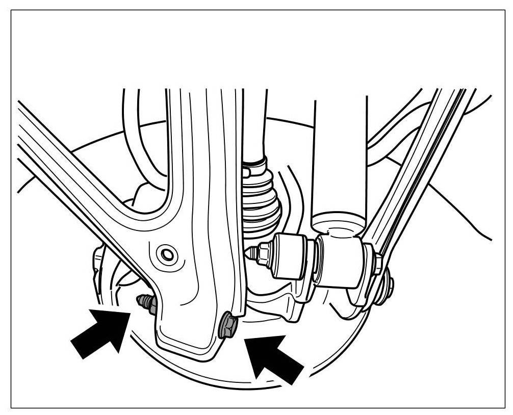 2. Loosen the lower trailing arm at the mount -arrows-.