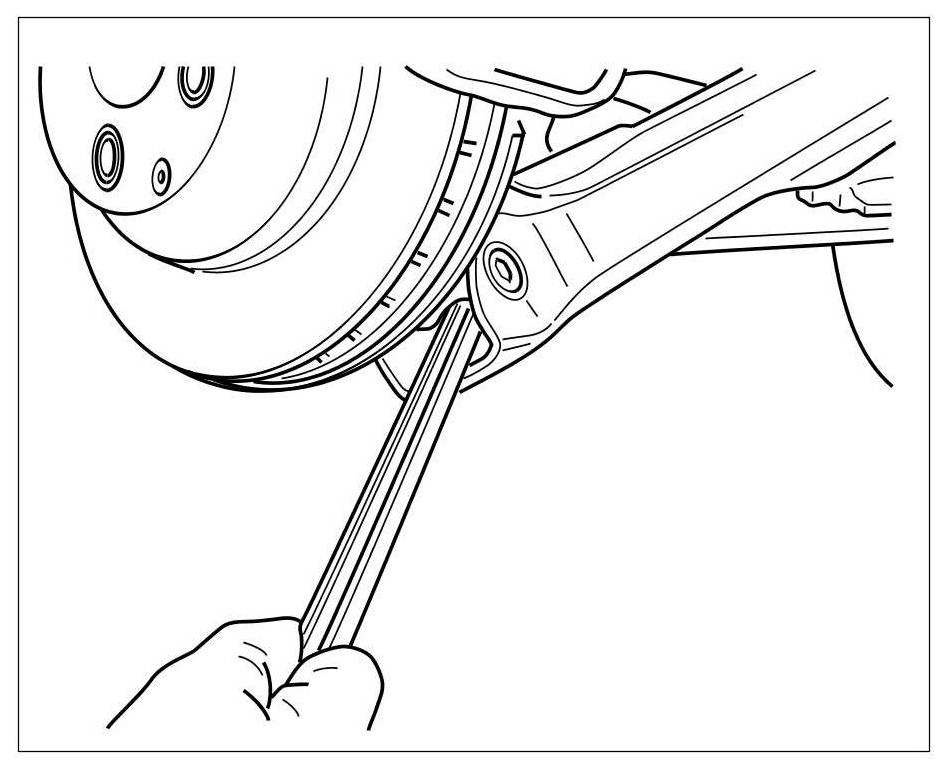 1. Release brake caliper and hang at a suitable position in the wheel well -> 474119 Removing and installing rear brake caliper 47411900 Removing and installing rear brake calliper. Do not open the brake system.