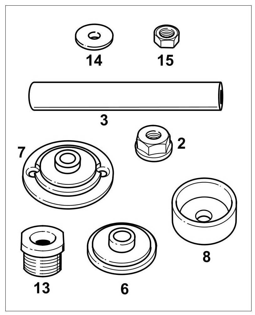 5. The pressure pieces and the tubular piston cylinder VAS 6178 are used for removal. No. 13 is screwed into the tubular piston cylinder. No. 2 is screwed on to the threaded rod and positioned in No. 13 for pressing out the bearing.