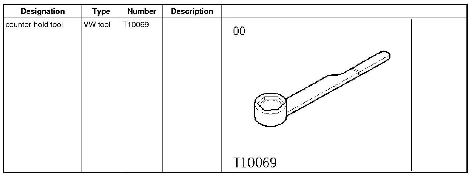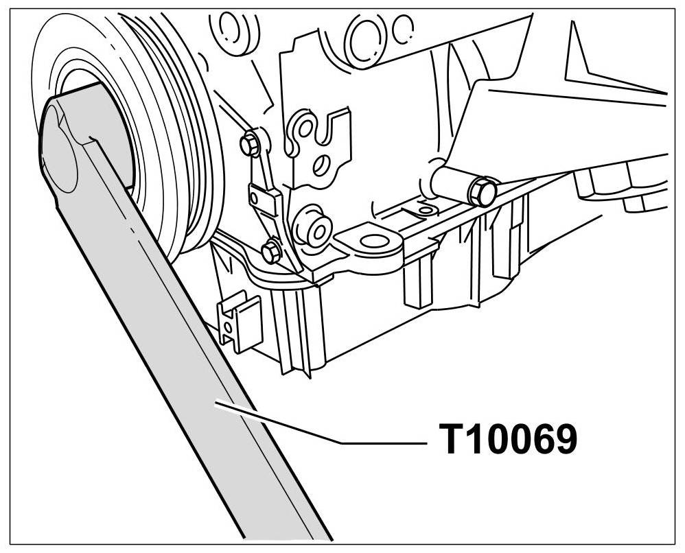 1. Block the crankshaft. To do this, get another person to help you hold the pulley securely at the front using counter-hold tool T10069 , => Blocking crankshaft.