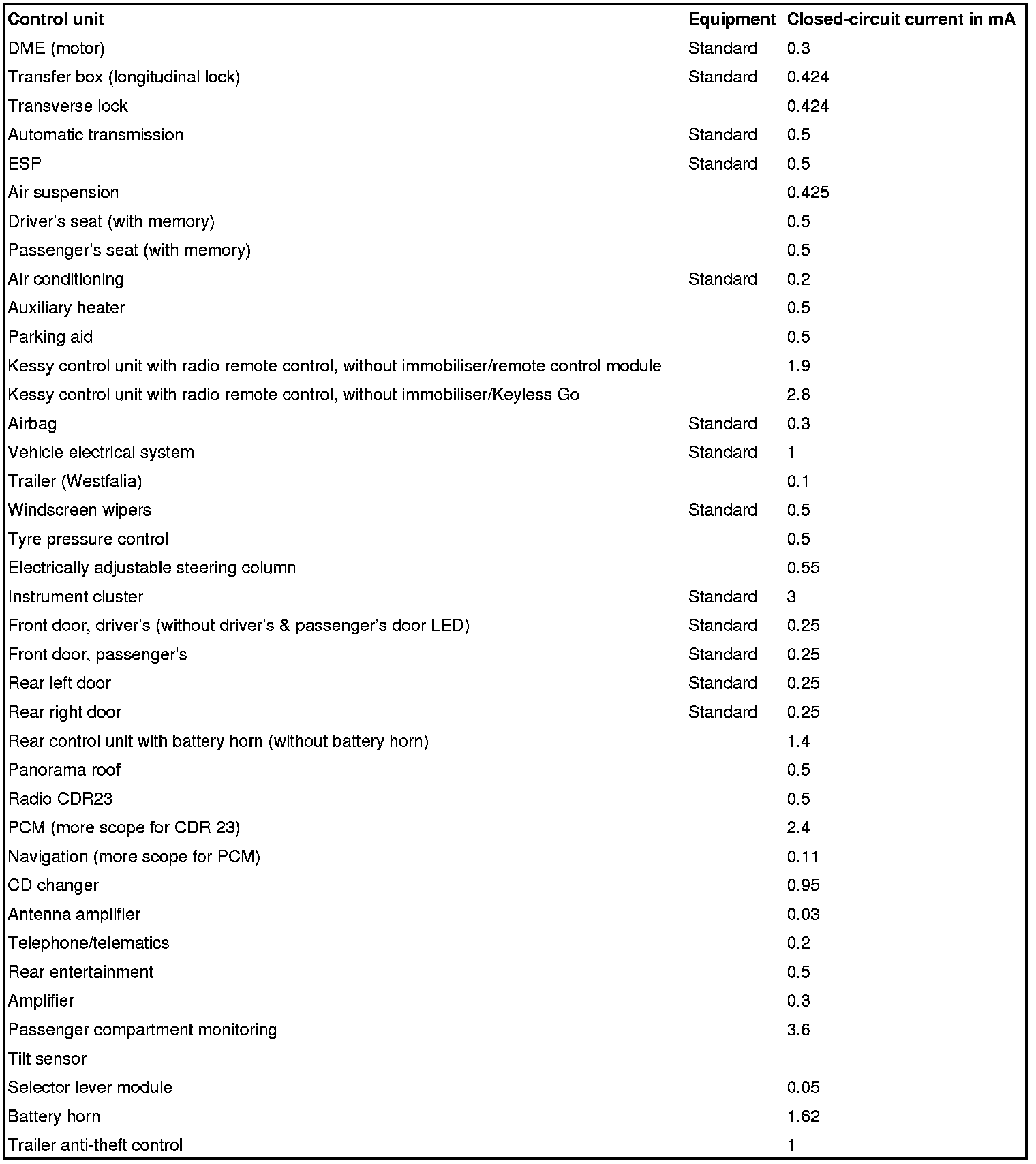 - Before measuring the closed-circuit current, determine the vehicle equipment (I-numbers) and establish the expected closed-circuit current with the aid of the attached table.