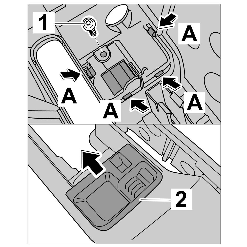 3. Unscrew fastening screw -1-. Press in locking tabs -Arrow A- and remove insert of locking mechanism -2-.