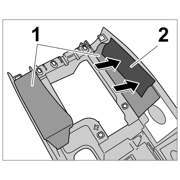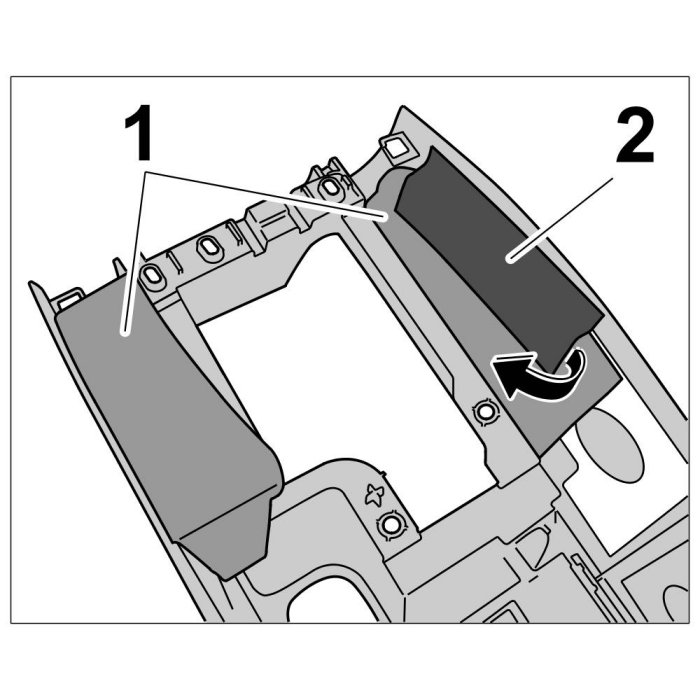 2. Position filler piece (sound absorber) -1- and use commercially available adhesive tape -2- to fix it to the centre console.
