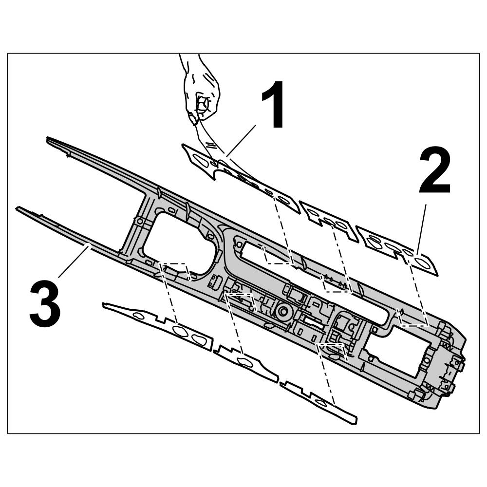 1. Remove protective film -1- from bonding point and stick sound absorbent film -2- inside the centre console -3-.