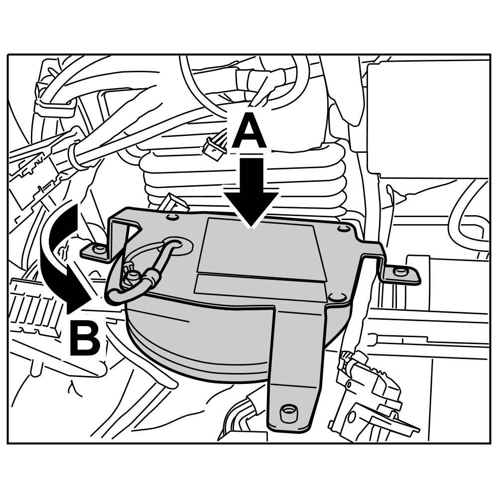 2. Insert suction fan for seat surface into the air duct -arrow A- , press it in and turn anti-clockwise -arrow B- until the suction fan for the seat surface is fully locked in the air duct.