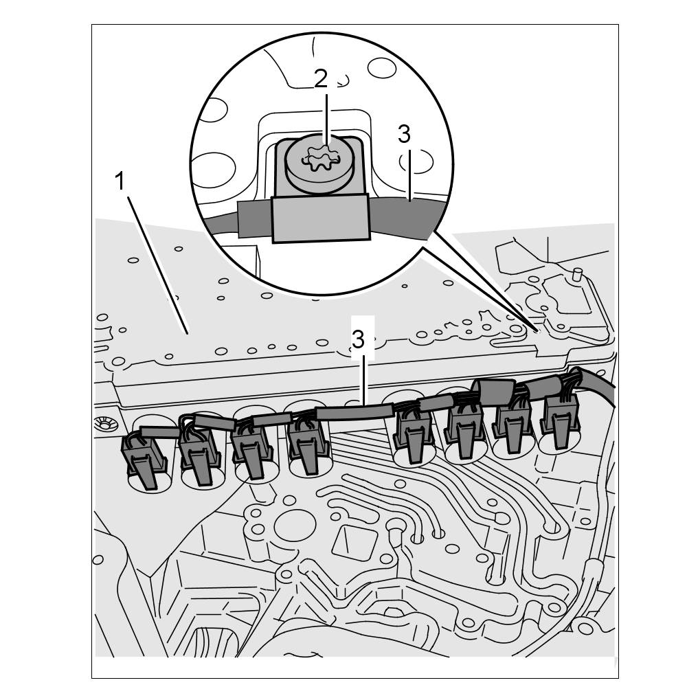 The wire harness for the solenoid valves -3- and the cable for the temperature sensor -4- must be routed in the recess between the transmission housing -2- and electrohydraulic control unit -1- because otherwise the cables can become squashed, resulting in damage and malfunctions.
