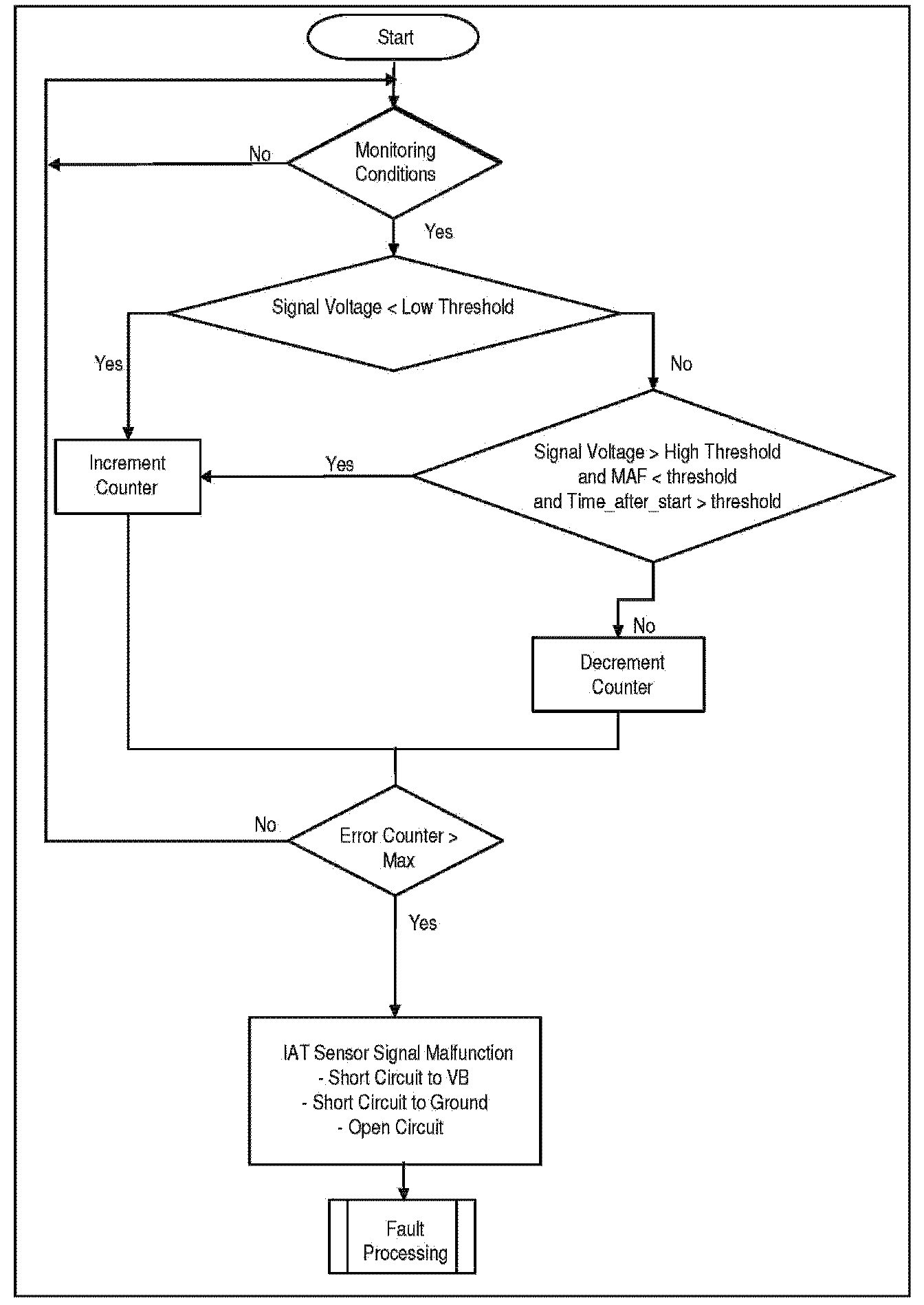 This diagnosis checks IAT for a Stuck signal. If the vehicle was driven for a mini-mum required distance and time-after-start, then the change in the IAT signal during this period should be above a calibrate able threshold. If this is not the case, a stuck IAT signal is detected.
