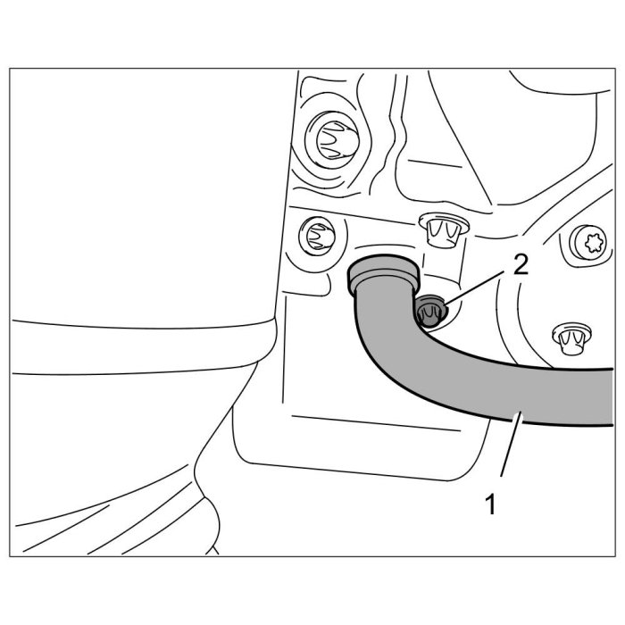 4. Fit and tighten external Torx screw (E10, M6 x 25) -2- on the secondary-air line -1- at the crankcase.