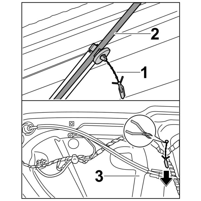 3. Use assembly string -1- to clip a new retaining clip on the bowden cable for power windows -2- and pull the assembly string through the door sub-frame -3- ( -arrow- ) until the retaining clip engages securely.