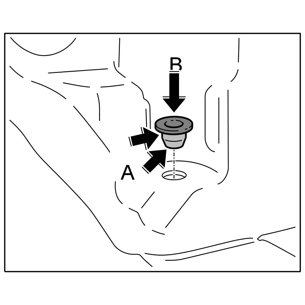 2. Apply a suitable rubber lubricant (tyre mounting paste) to the sealing surface -arrows A- and press the pump for the windscreen washer system into the rubber seal -arrow B- until the pump is felt to engage.