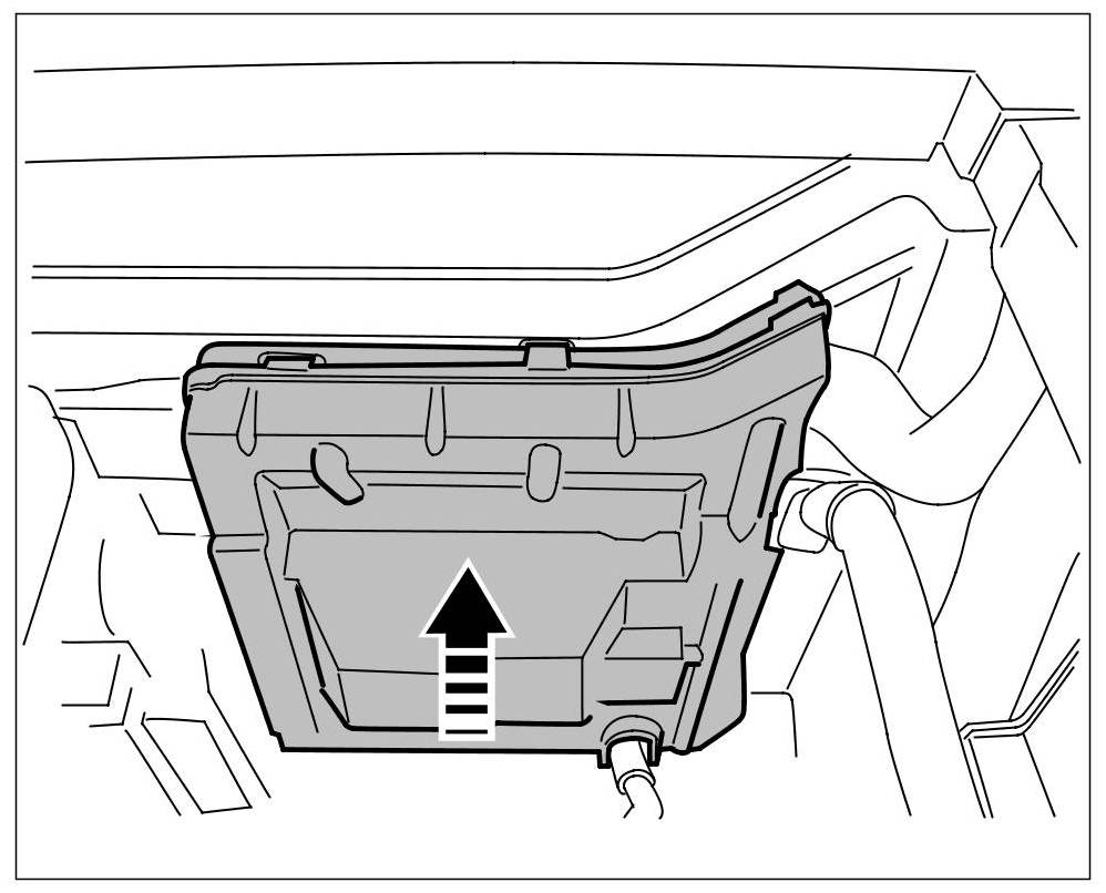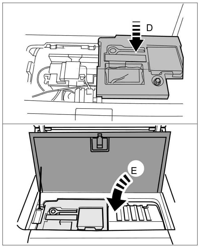 9. Insert the toolbox -arrow D- and close the luggage compartment tray -arrow E-.