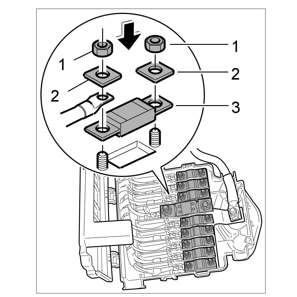 3. Place the fuse element -3- into position, fit the washer -2- and secure with the fastening nuts -1-. => Tightening torque: M6>>8 Nm (6 ftlb.) => Tightening torque: M8>>15 Nm (11 ftlb.)