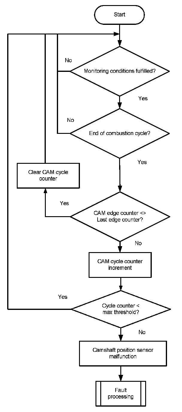 The monitor checks once per combustion cycle the edge counter of the camshaft. If the edge counter has not changed during the last cycle, a cycle counter is incremented. When the counter reaches a threshold, the error CAM_plaus is delivered to the error management.