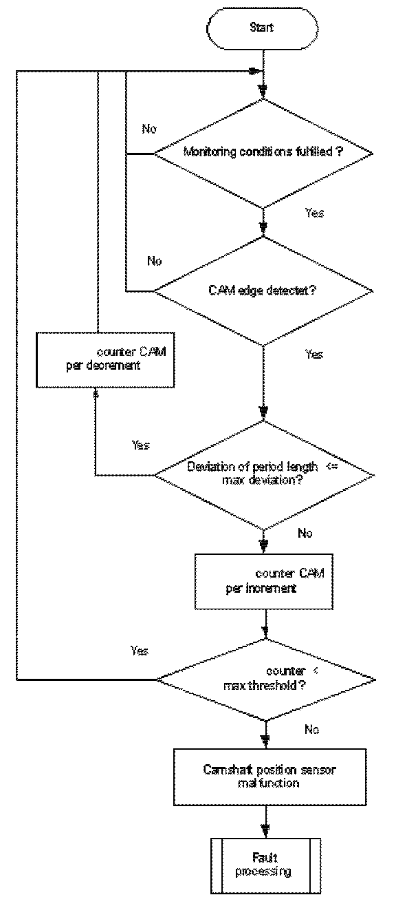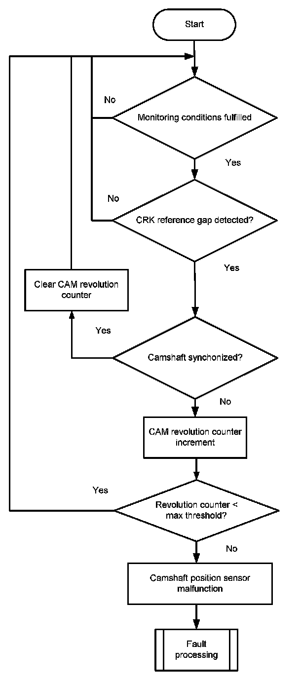 The monitor checks at every reference gap of the crankshaft sensor signal whether the camshaft is synchronized or not. If the camshaft is not synchronized, a revolution counter for the camshaft is incremented. When the counter reaches a threshold the error CAM sync is delivered to the error management.