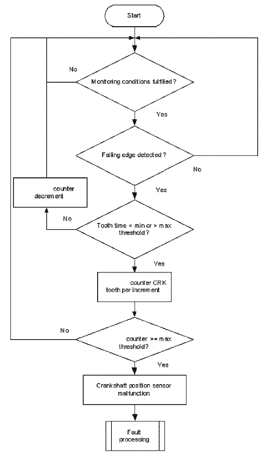 A teeth counter is incremented at every falling edge of the CRK sensor signal. If plus or minus one tooth is detected Flowchart diagnosis of mechanical reference position and diagnosis of chain jump. 360 °CA at the reference gap, the tooth number counter will be incremented. If the counter exceeds a limit, a CRK tooth error is delivered to the error management.