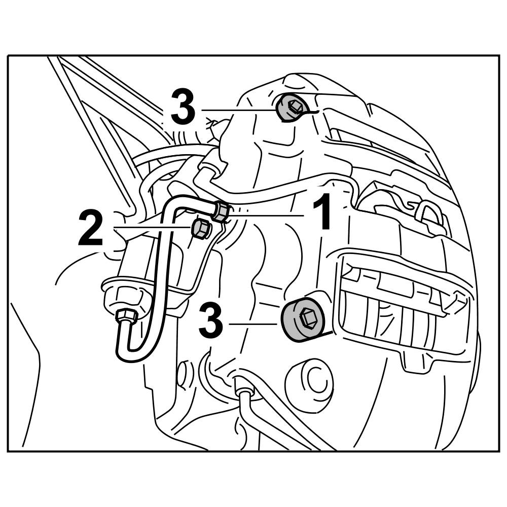 Tightening torques: Brake line -1- = 12-14 Nm (9-10.5 ftlb.)/holder (M6 screw) -2- = 10 Nm (7.5 ftlb.).