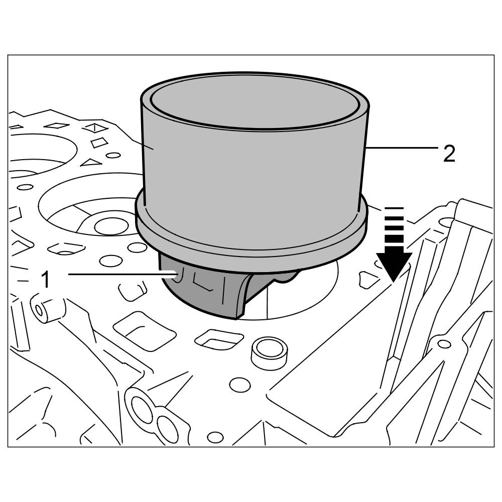 5.5. Insert the piston -1- as far as required into the assembly sleeve -2- until the lower edge of the piston is flush with the surface of the sleeve.