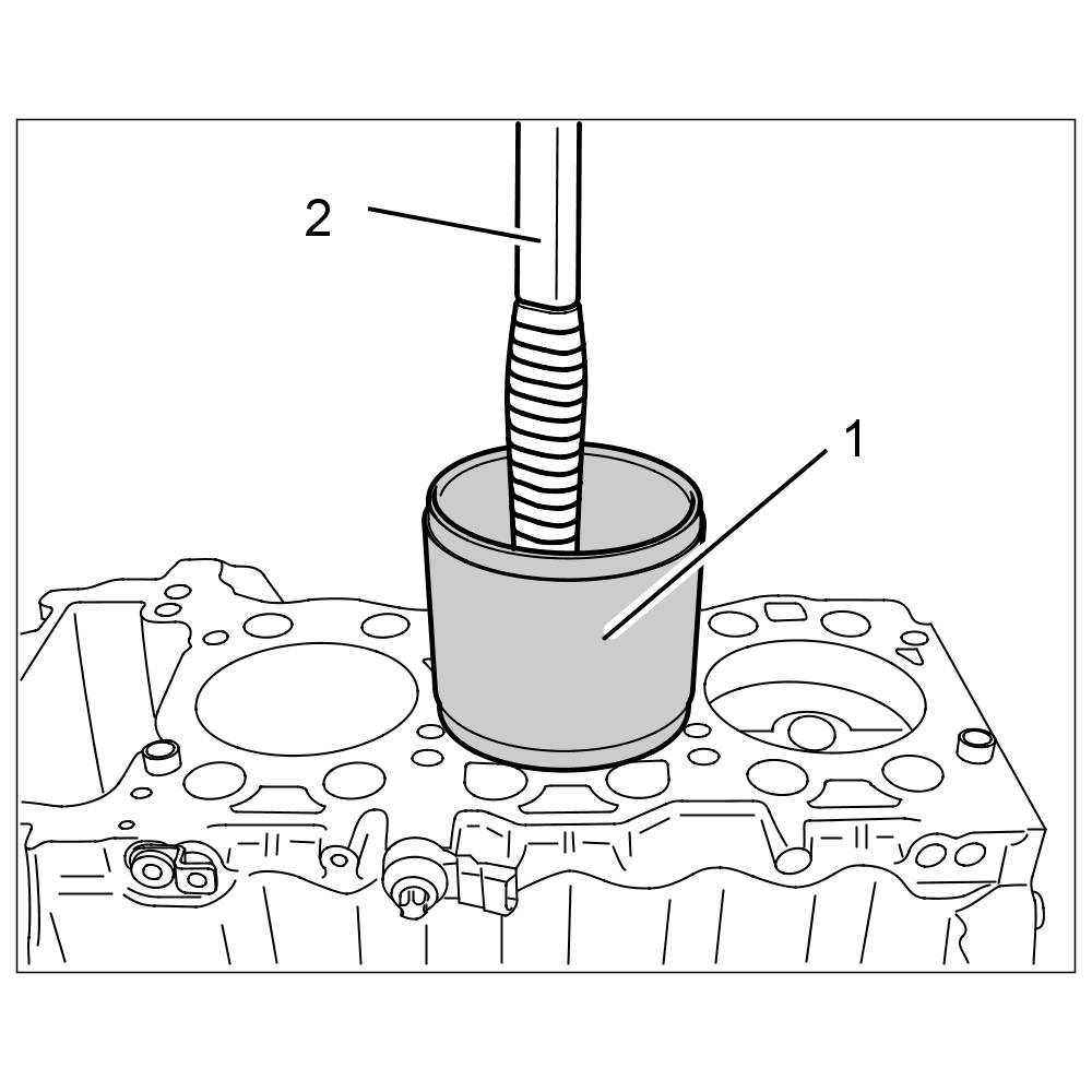 4.7. Press the piston into the cylinder bore immediately and hold the assembly funnel -1- firmly while doing this. The wooden handle of a hammer -2- can be used to do this.