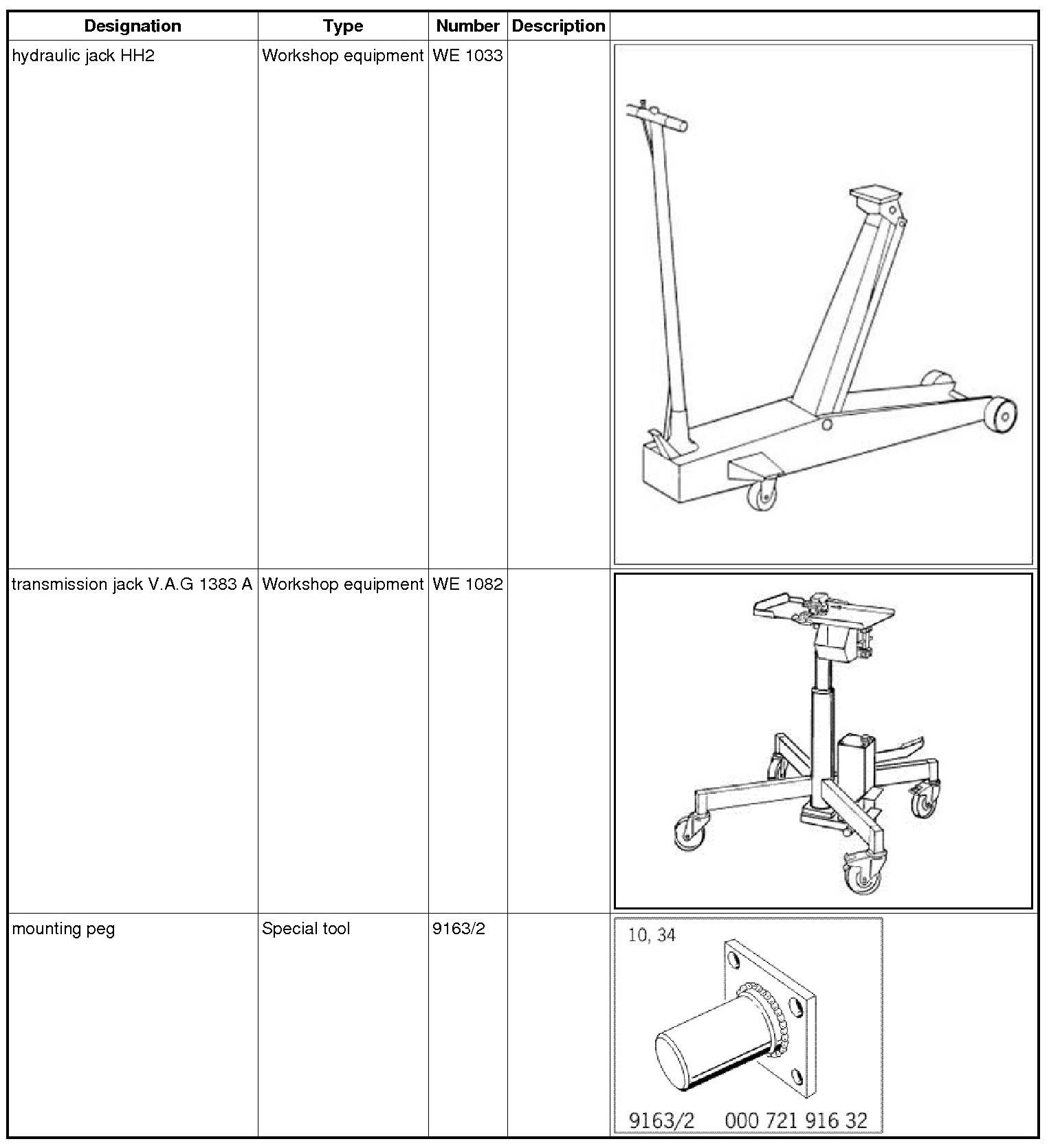 1.1. Support the engine at the oil pan using the hydraulic jack HH2 WE 1033 and transmission jack plate of transmission jack V.A.G 1383 A WE 1082.