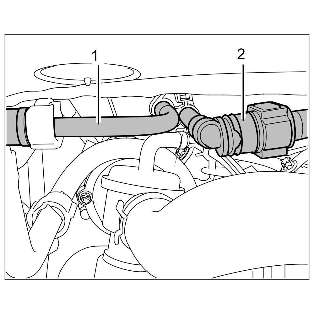 5. Connect the fuel line -1- and vacuum line -2- in the engine compartment and clip them into the line bracket.