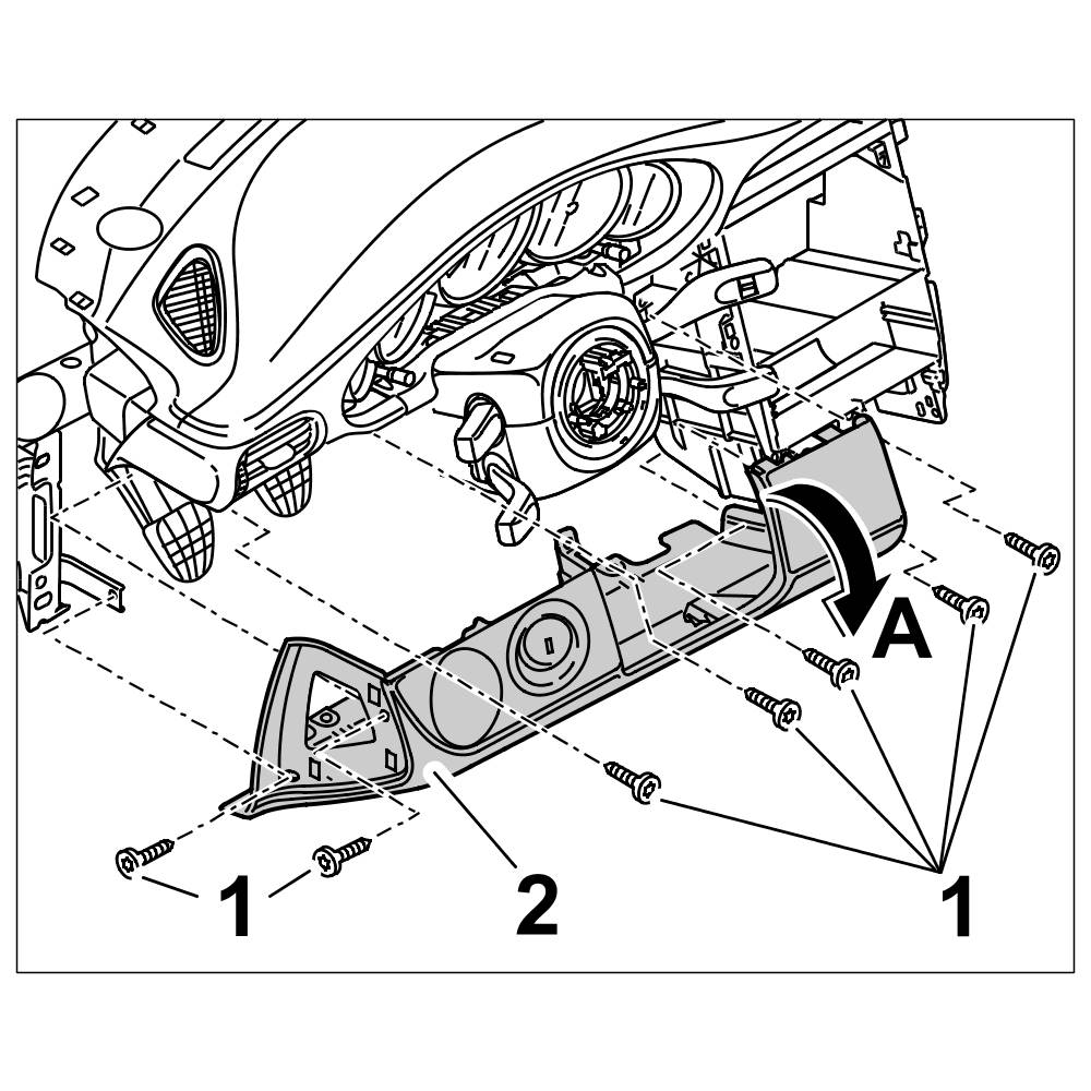 2. Remove trim panel (dashboard lower part). To do this, unscrew the fastening screws -1- and swivel the trim panel under the dashboard on the driver's side -2- downwards -Arrow A- -> 701919 Removing and installing trim panel under dashboard 701919 Removing and Installing Trim Under Dashboard.