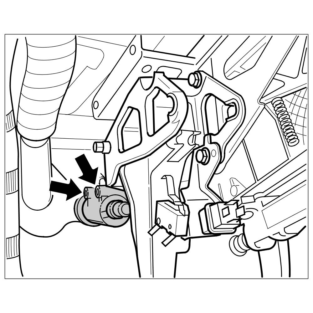 If creaking noises (over approx. 2/3 of the lift area) are heard after installing the clutch pedal, these may be coming from the connection between the ball head piston rod and piston seat of the clutch master cylinder -arrow-. In this case, spray a minimal amount of multipurpose oil on the connection point using a metering tube -arrow-. Important: The lubricant must only be applied to this connection point so make sure not to use too much. This connection point cannot be taken apart without damaging it irreparably.