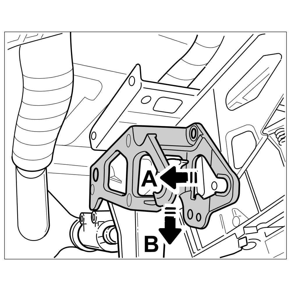 6. Loosen bracket for clutch power spring (support for clutch pedal switch and remove interlock switch, if necessary) => Bracket for clutch power spring. Carefully move bracket for clutch power spring approximately 2-4 mm to the left -A-. Carefully turn bracket for clutch power spring clockwise on the pedal bearing axle approximately 10-15 degrees -B-.