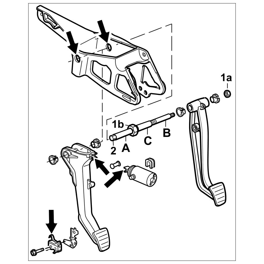 Grease bracket in area of pedal bearing axle -arrows- with Renocal (Glissando VW 745). Part No. 000.043.206.21 (10g tube).