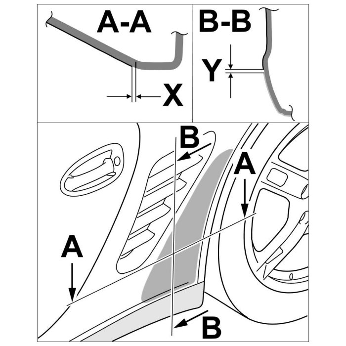 4. Affix film to vehicle to the dimension -X= 0.5 + 1.5 mm- and press lightly. Slight adjustments to the position can still be made.