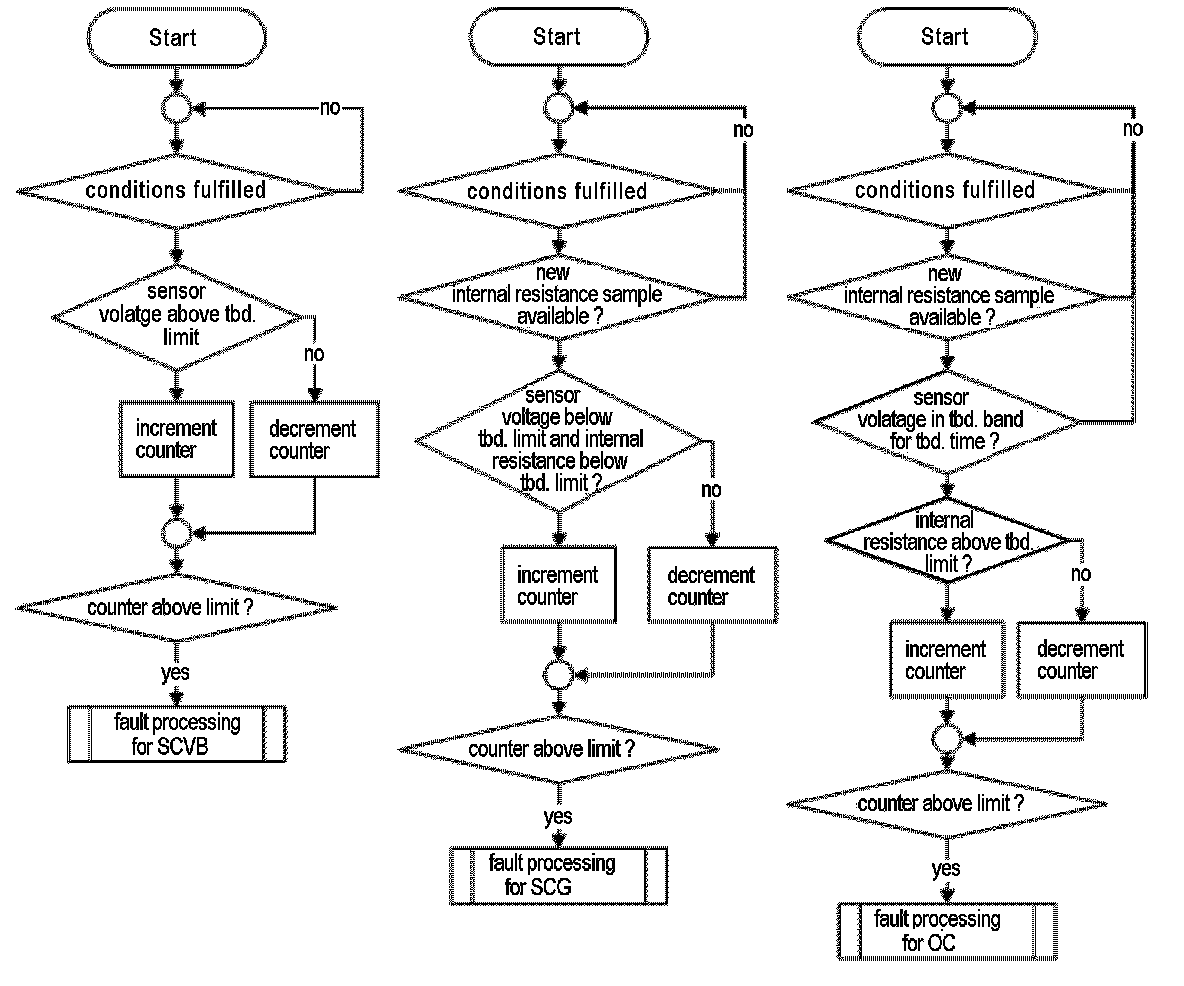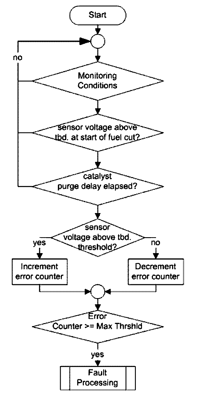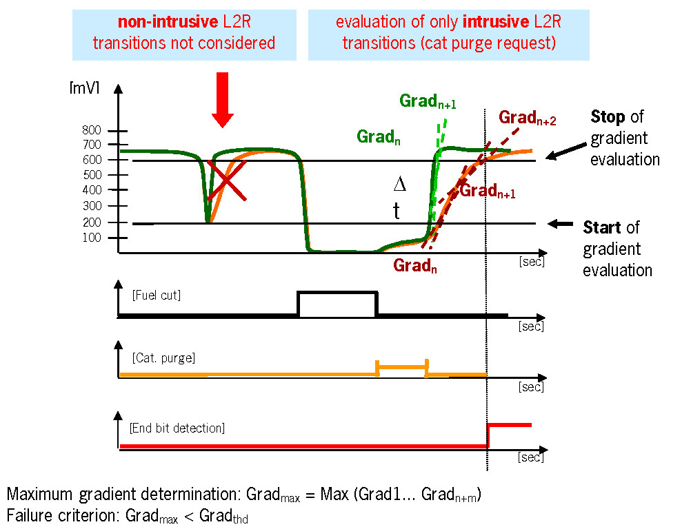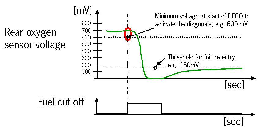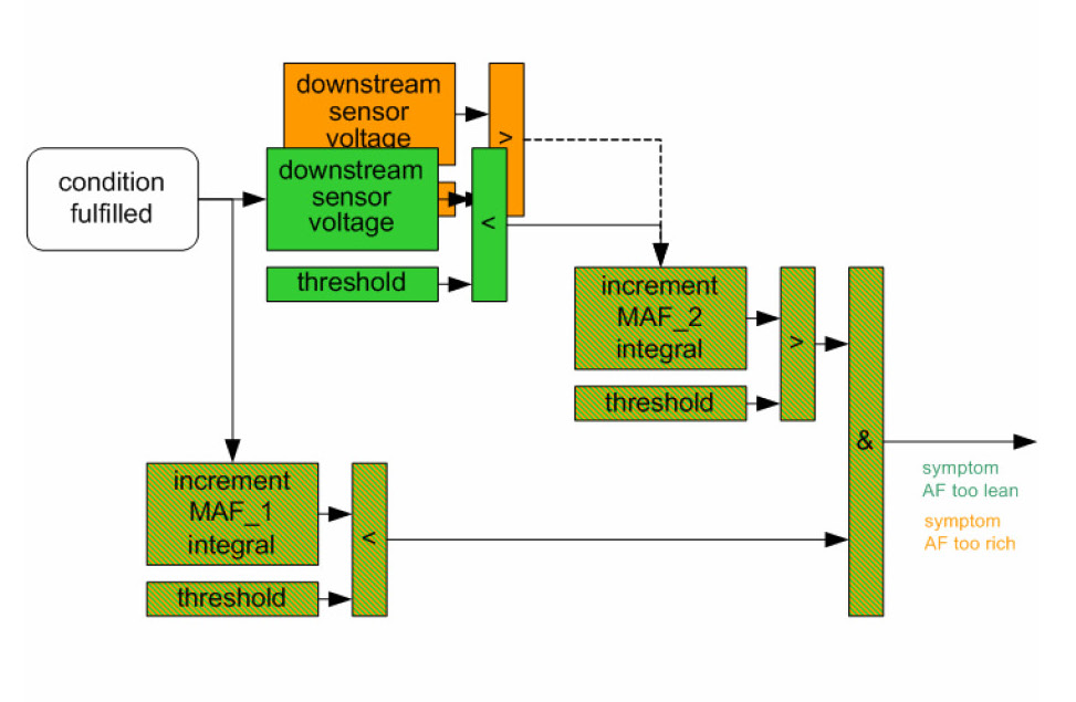 1. Part one monitors the downstream sensor voltage during active fuel trim controller p-share. If the fuel trim control is active, the downstream sensor voltage must be in a band around the trim control set point. If the voltage is outside this band, a mass air flow integral is incremented. If this integral is over a threshold, a malfunction is detected (see also picture below.). When the downstream sensor voltage will not switch to rich before the integral is over a threshold after a fuel cut-off phase, then this fault will be stored, too.