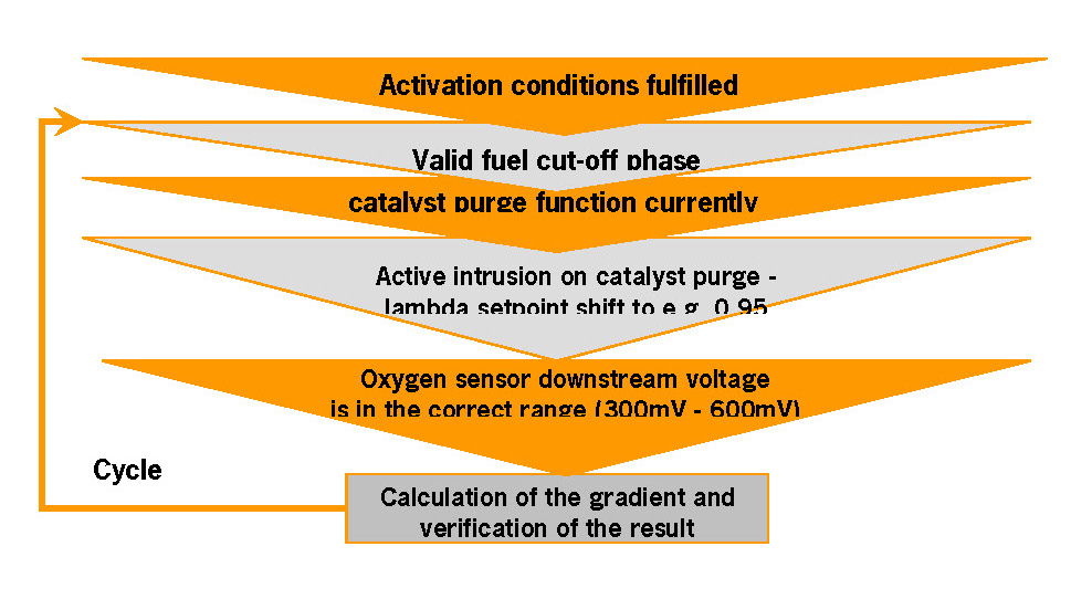 After leaving a deceleration fuel cut phase the engine is operated rich for a short period to bring the catalyst back into the designated operation point: Catalyst purge. The downstream oxygen sensor's signal gradient at the end of the catalyst purge phase is sampled to determine the too slow sensors.
