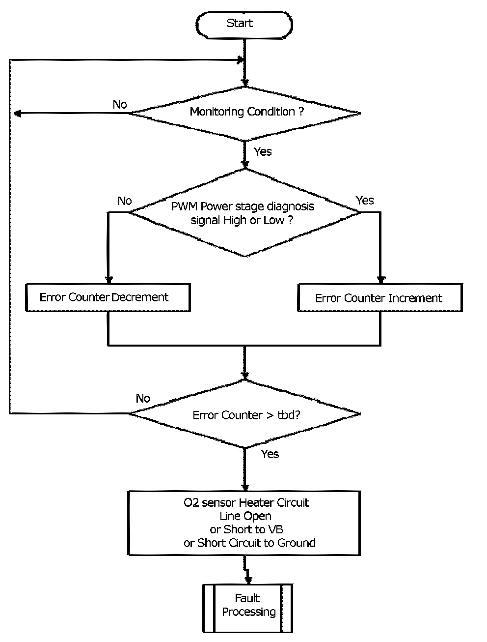 The purpose of this monitor is to detect errors within the O2 Sensor Heater Circuit. The signal for the O2 sensor heater is pulse-width modulated. The signal of the power stage is monitored internally by the driver. The driver can distinguish between three symptoms: