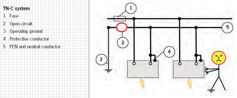 In the TN-C system (C=combined), the neutral conductor simultaneously assumes the function of the protective conductor (see "Protection class 1") because the protective conductor is connected directly to the PEN conductor on the consumer and therefore connected to the operating ground as well. The disadvantage of this system comes at the moment during which the PEN conductor between the consumer and energy producer is interrupted. The connection between the protective and PEN conductors then makes available the full nominal voltage between all conductive housings and ground.