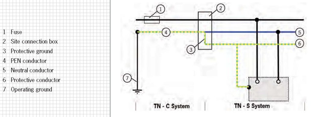 are combined in the TN-C-S system. The longer transmission path between the energy producer and the consumer on the TN-C system is combined with the consumer installation on the TN-S system. In the site connection box (=transmission point), the PEN conductor is divided into neutral and protective conductors.