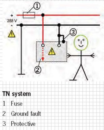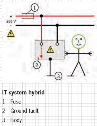 In a similar way to protective separation, current does not flow between the housing and the body of the vehicle in the event of a fault (ground fault). Furthermore, the fuse does not shut down the system in the same way as the TN system because a system shutdown is not necessary. The high-voltage system remains operative (1 fault system) and the hybrid vehicle can therefore visit the workshop without posing a danger.
